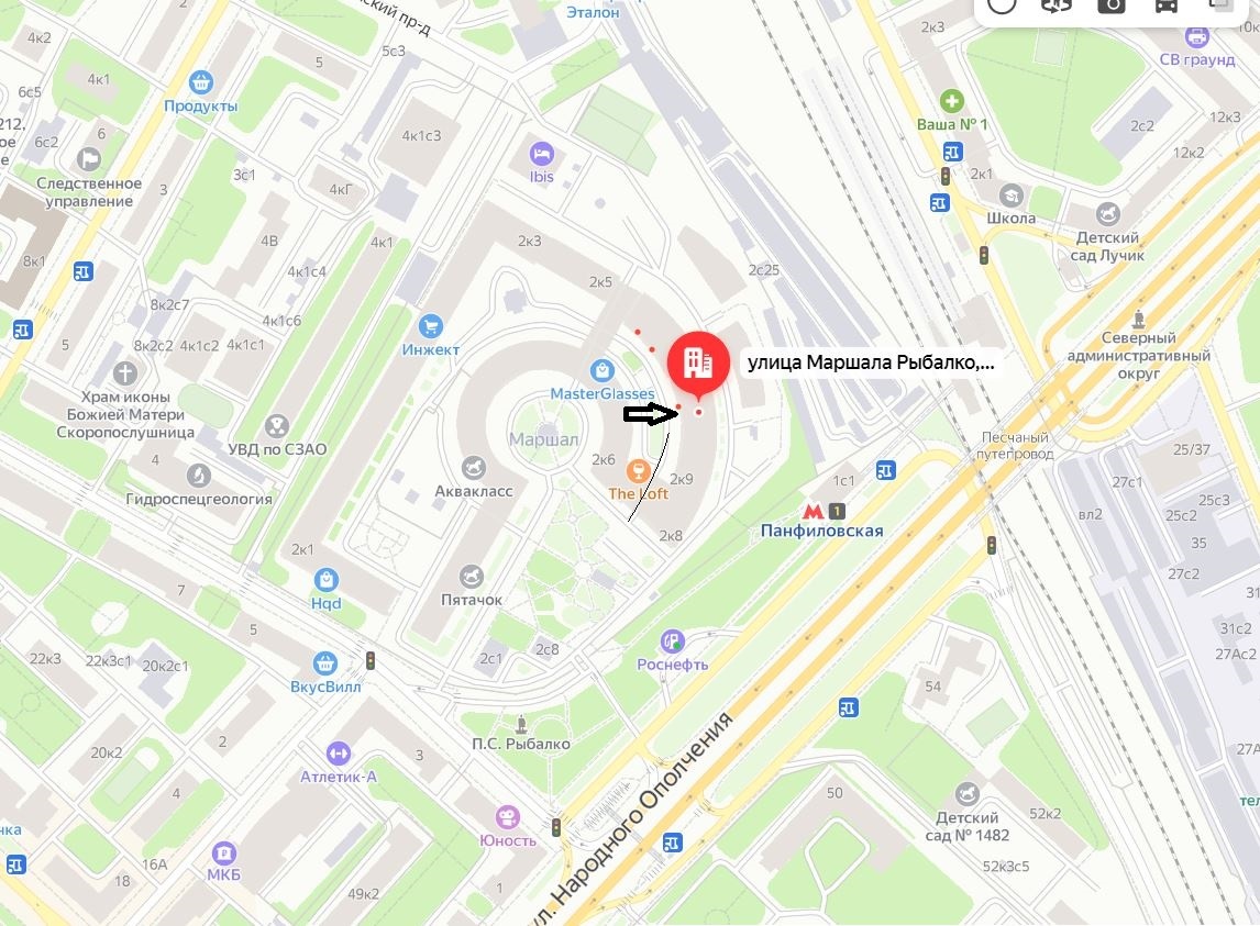 Мы находимся по адресу: г.Москва, ЖК "Маршал", улица Маршала Рыбалко, дом 2, корпус 9, подъезд 5, этаж 7, офис 635.3